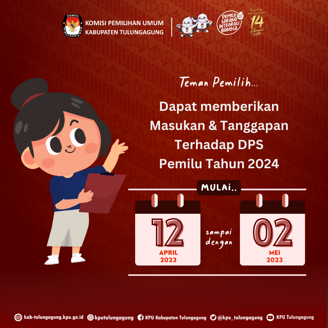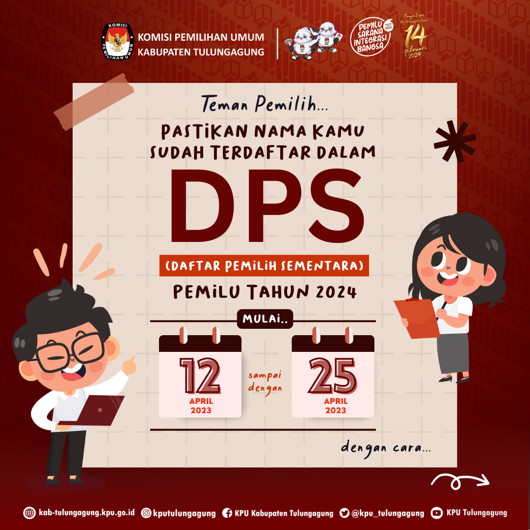 Tulungagung(kab-tulungagung.kpu.go.id) Mulai tanggal 12 s.d 25 April 2023 KPU Kabupaten Tulungagung mengumumkan Daftar Pemilih Sementara (DPS) Pemilu Tahun 2024 yang diumumkan serentak oleh PPS seKabupaten Tulungagung, Tahapan ini dilaksanakan agar diketahui oleh masyarakat secara luas, "Pengumuman ini diharapkan agar seluruh masyarakat tulungagung yang mempunyai hak pilih dapat mengecek secara langsung apakah namanya sudah terdaftar sebagai pemilih apa belum“, tutur Susanah, disampaikan saat ditemui tim humas KPU Kabupaten Tulungagung.
